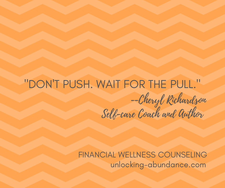 Simply the act of not being able to be our authentic selves can lead to these stress responses taking over and money-mishandling. In order to get back to that authentic you, clarify your Core Values and your WHY. You can also do an “integrity-check”, seeing how your actions/behaviors lately match up with those values. Martha Beck, who authored the book The Way of Integrity tells us to “Move towards that which naturally interests you” rather than succumbing to societal expectations and norms out of pressure or people-pleasing.