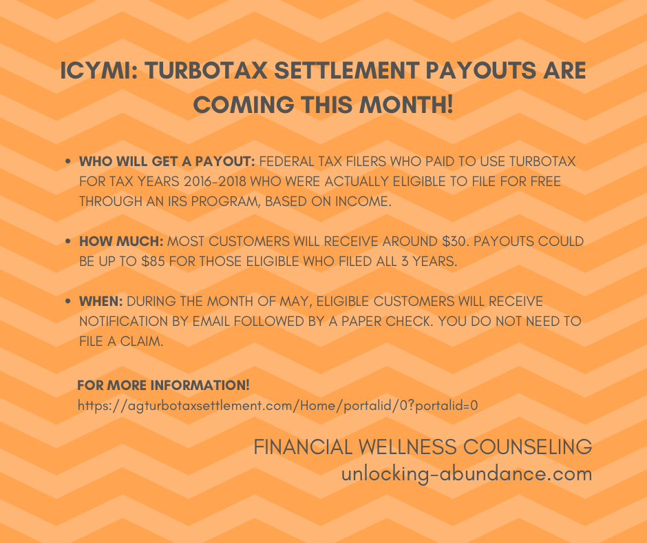 Be aware that you might be eligible to file your taxes for free! Also, note the amount of time it takes for these settlements to work themselves out. In this case it was 4 years between complaint and payments!
