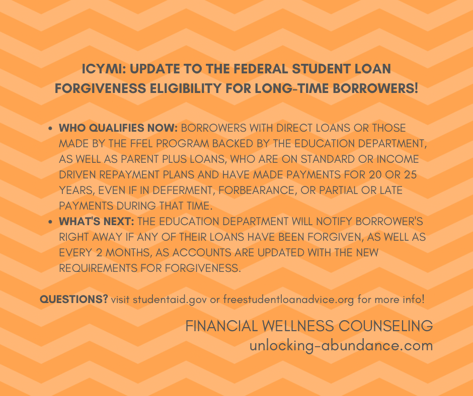 It was announced that a sweeping over-haul will be made to the Income Driven Repayment Forgiveness option (which has long been in place for borrower’s who have paid either 20 or 25 years of payments, on a income-based plan) to be more accessible, much like they did previously with the Public Service Loan Forgiveness option. Read below for the latest details.