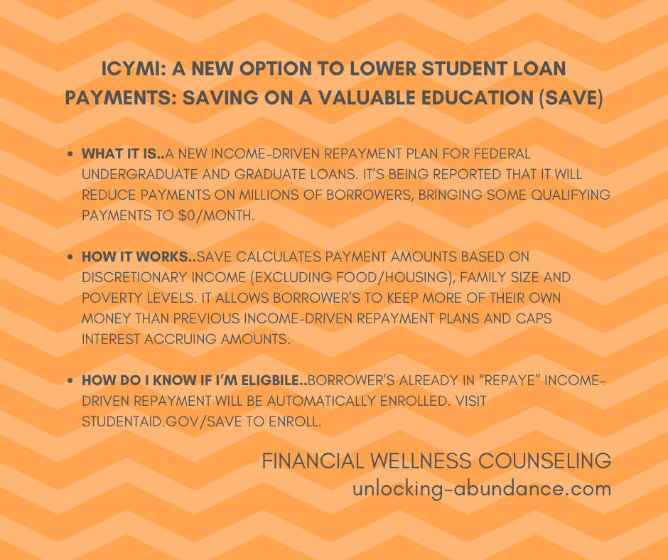 ICYMI, there is a new Income-Driven Repayment Plan option, called Saving on a Valuable Education (SAVE) that could significantly reduce monthly payment amounts! SAVE replaces the REPAYE income-driven repayment plan and will be eligible for borrowers based on a calculation of their discretionary income (income excluding essentials like rent/food) and family size in relation to poverty levels.