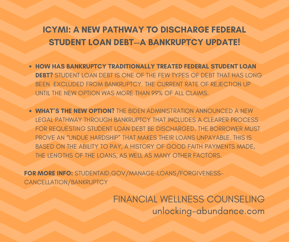 When it comes to methods for eliminating Student Debt, another new policy is gaining steam! In November of 2022, The Biden Administration offered a new path for those filing bankruptcy that essentially makes it a little bit easier for Student Loan debt to be discharged.