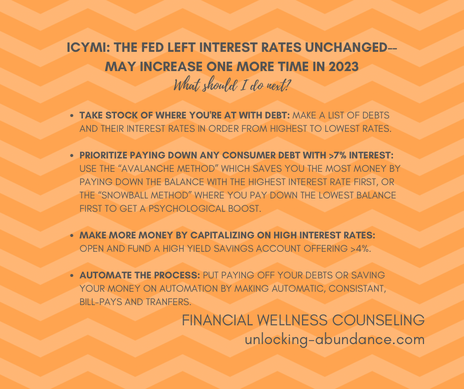 ICYMI, the “Fed” (aka Federal Reserve who sets the prime interest rates and basically regulates all things finance in the US) announced last week that the rising interest rates we’ve all been experiencing lately will take a pause.