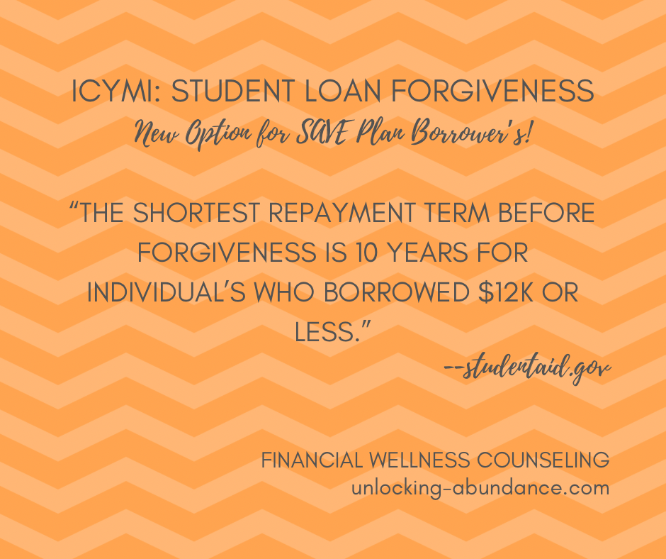 Calling all Student Loan borrower’s with Undergraduate debt! Another roll-out of Student Loan Forgiveness is happening! If you’ve been paying on your Student Loans for at least 10 years, and you’re on an Income Driven Repayment Plan (IDR), read below to find out if you’re eligible!
