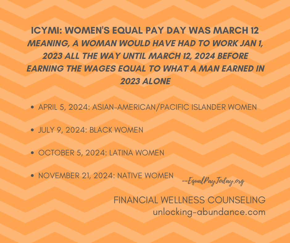 March is Women’s History Month, and ICYMI, Equal Pay Day fell on March 12th this year. (That’s 2 days earlier than last year, so..yay, progress?) At this rate, though, it’s been calculated that equal pay might have a chance of being obtained by year 2124, or later. Ugh. Read below for the status of Equal Pay today, a reminder on the factors that drive this inequity, and a few organizations striving for progress!