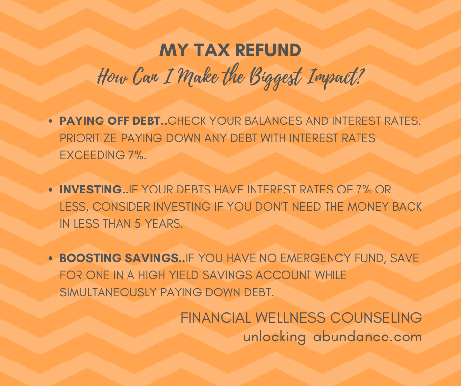 What did you, or will you do, with yours? If you are interested in making the greatest impact, read below for a few guidelines around whether to pay off debt, invest, or put your refund into savings!
