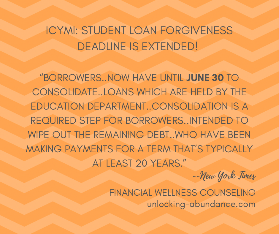 As discussed previously, there is an opportunity for Student Loan borrowers who have been making payments for 20 years or more to have their balances forgiven. This loan forgiveness requires loan consolidation. Borrower’s were allowed to consolidate their loans by the end of April—now, that deadline has been extended to June 30th, 2024!