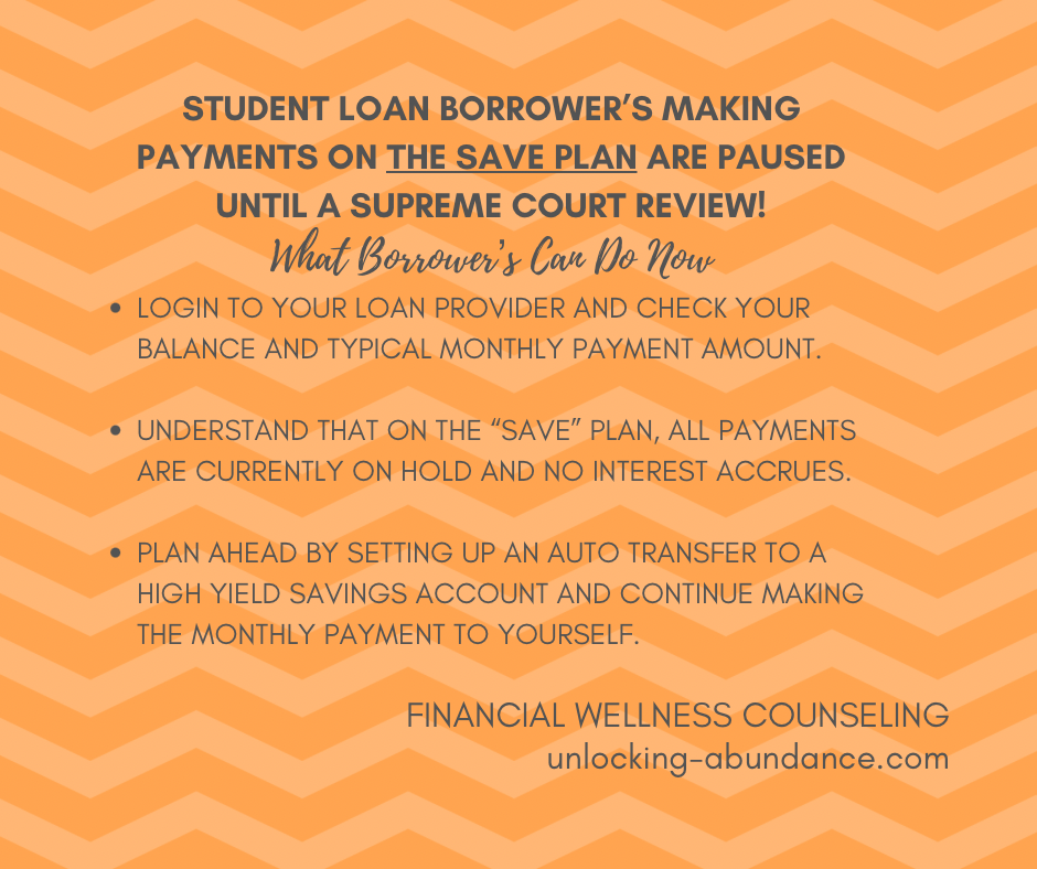 If you’re a borrower enrolled in SAVE..a good strategy is to ‘hope for the best, plan for the worst’. In other words, identify what is within your control right now. Can you login and reacquaint yourself with your student loan balance and usual payment amount? Can you repurpose the amount you were paying towards your loans, to be inline with a financial goal?